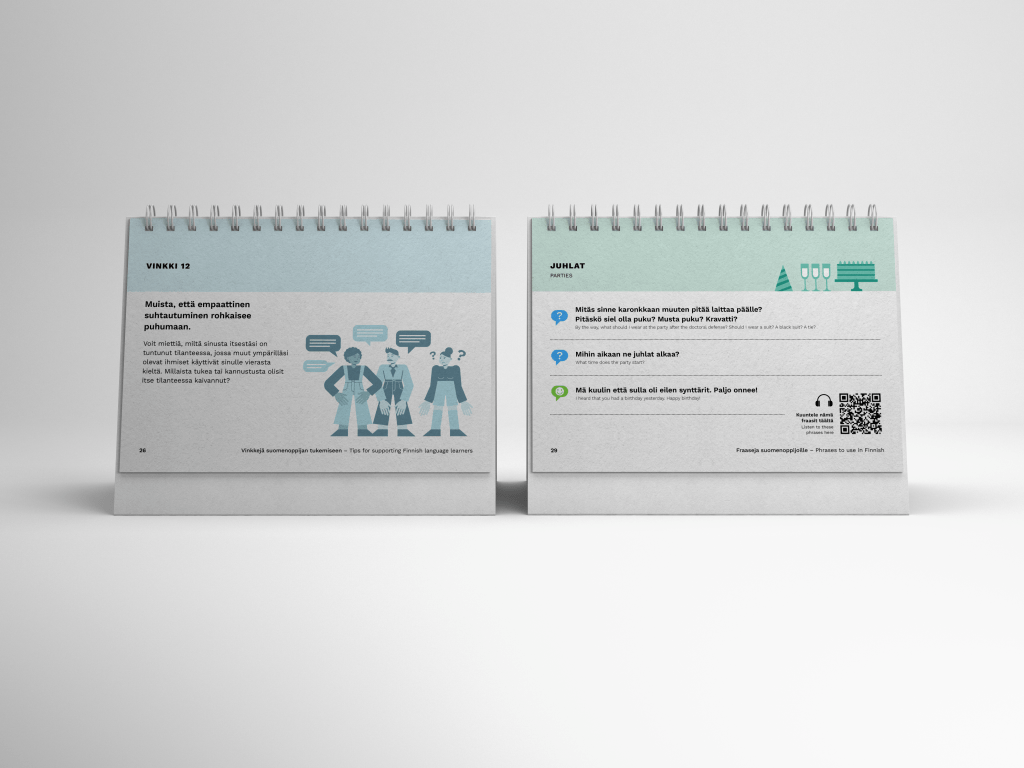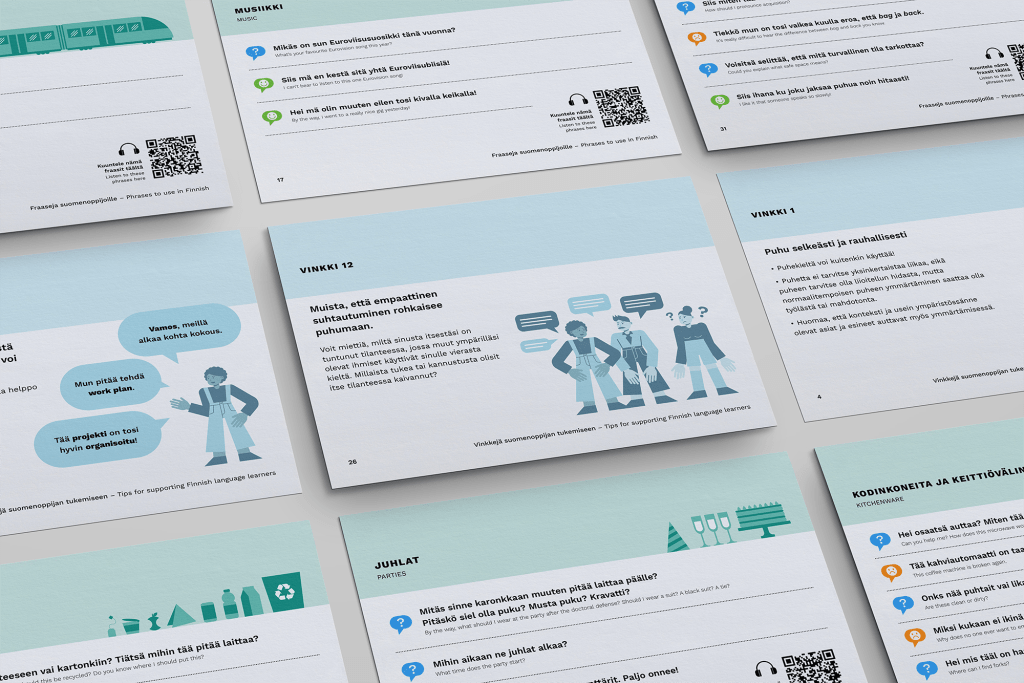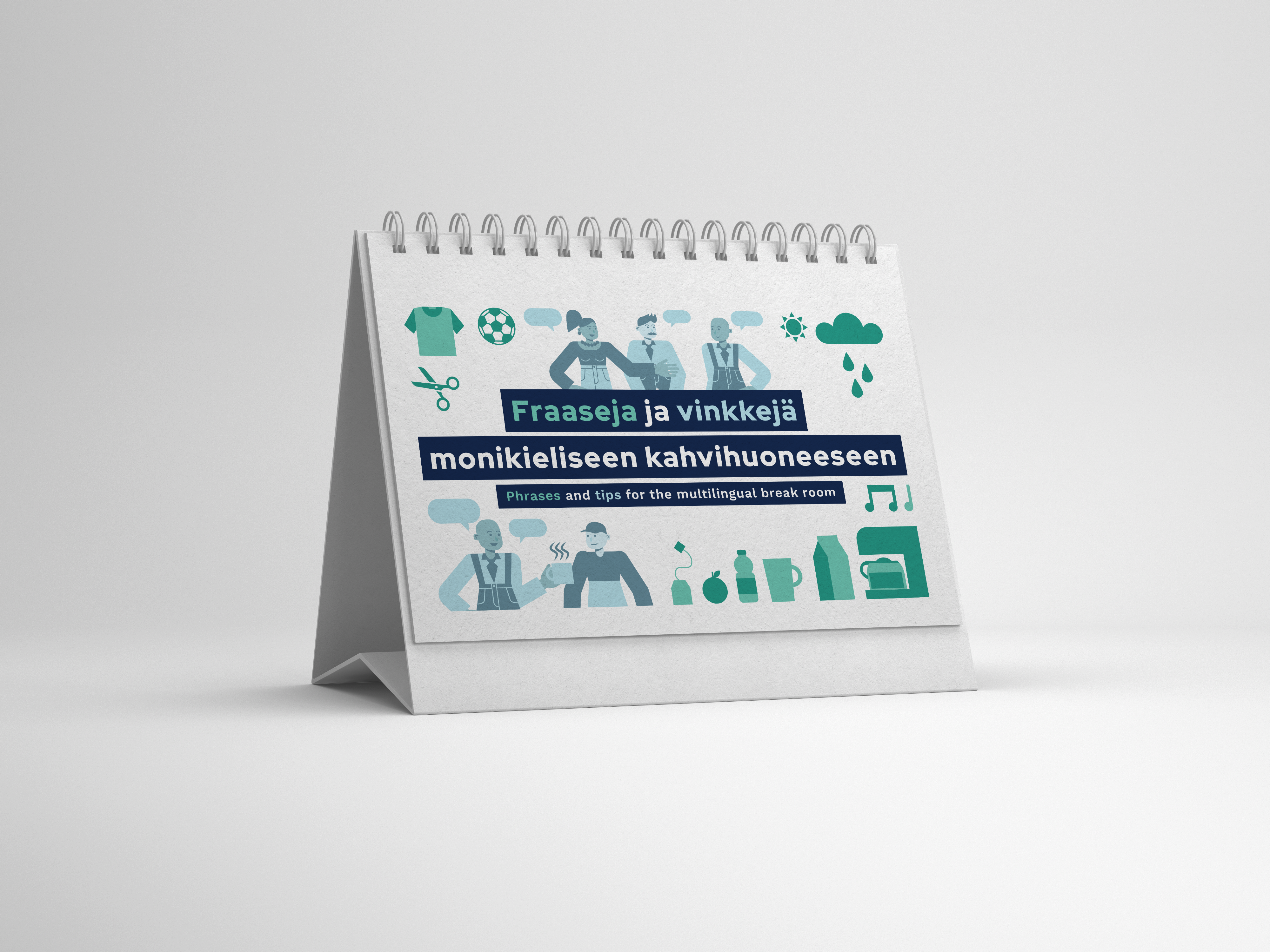 What sets this booklet apart is its dual-sided design, catering to both learners of Finnish and their supporters, such as colleagues. One side is tailored for learners, while the other is for those supporting them. For example, the learners’ side contains everyday phrases like, “How does this microwave work?”, while the supporters’ side offers helpful tips such as, “Speak calmly, but not too slowly.”