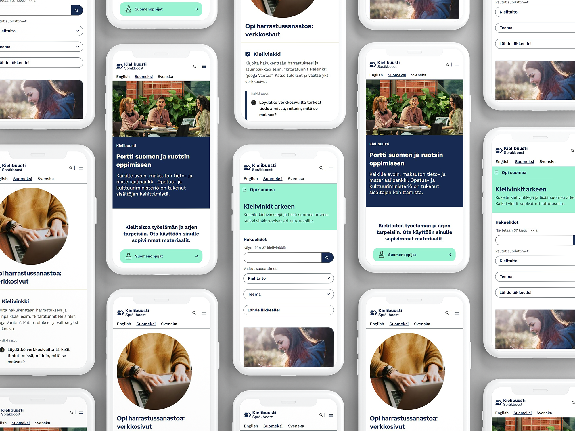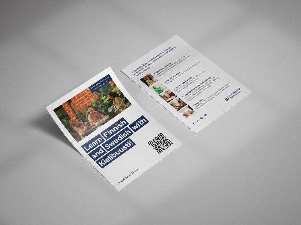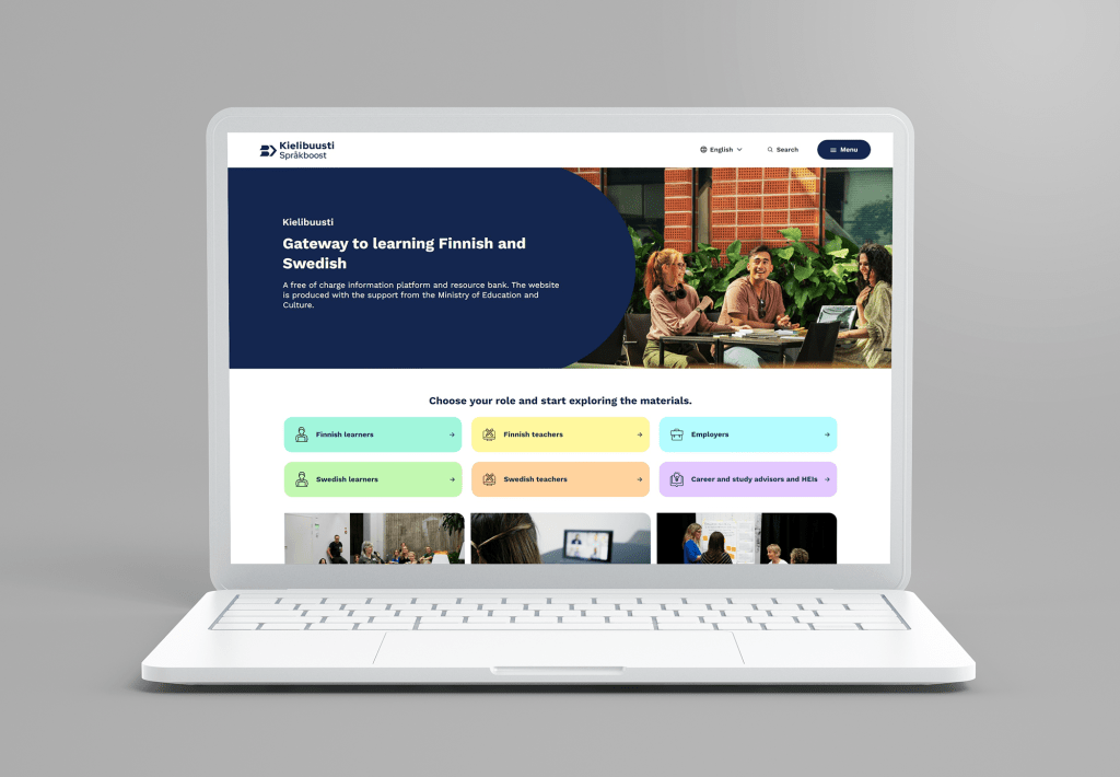 As part of the identity, a custom photo library was developed in collaboration with several photographers, ensuring a cohesive visual experience across all materials. Kielibuusti’s identity was consistently applied across various platforms, including the website (language learning portal). It was designed in collaboration with Amy Järvisalo (UI&UX), Oskari Anttonen (UI&UX) and Salla Vaalio (service design & UX research).